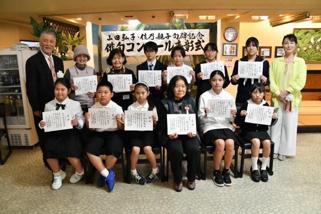 山田弘子・佳乃親子句碑記念俳句コンクール(主催・同実行委員会)の表彰式が23日、市内のレストランで開かれた。平良虹羽(こはね、平良第一小3年)さんら特選5人を含む入賞20人に表彰状が贈られた。表彰式後は記念俳句会や祝賀会も実施された。