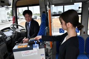 きょう5日から宮古協栄バス(豊見山忠朗代表社員)、中央交通(森良知社長)の計7路線で乗車料金のキャッシュレス決済が導入されるのを記念して4日、関係者による「タッチ決済導入記念イベント」が下地島空港で行われた。嘉数登市長や佐久川憲一協栄バス総務部長、森社長、琉球銀行の島袋健頭取ら関係者がテープカットで導入を祝い、利用する市民や観光客の利便性向上を期待した。