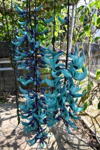長浜博昭さん(平良狩俣間那津集落)の庭で、「緑の宝石」と呼ばれる鮮やかな青緑色をしたヒスイカズラ(翡翠葛)の花が咲いた。大小さまざまの蕾も見られ、これからさらに見頃を迎えそうだ。長浜さんは「咲くたびに神秘的な色に引かれる」と笑顔を見せた。