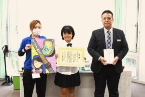 第53回JA共済全国小・中学生交通安全ポスターコンクールの表彰伝達式が12日、JA宮古地区本部で行われた。家の光協会賞会長賞(ちゃぐりん賞)に輝いた荷川取心結(みゆ)さん(久松小4年)に同本部の久志隆盛本部長から賞状が伝達された。
