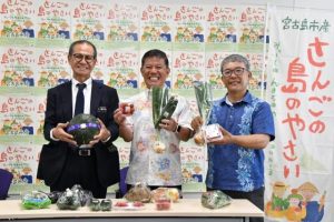 市地産地消推進協議会(奥平幸司会長)は14日、市役所で記者会見し、宮古島産の野菜をPRするロゴマークを発表した。キャッチフレーズの「さんごの島のやさい」とイラストが記載されたシールを袋に貼ることで、地元産の野菜の差別化が図れる。宮古島を「地産地消の島」としての認知度を高めていくことを目指す。