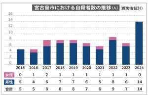 宮古島市で昨年1~12月の一年間に自殺した人(暫定値)は14人で、前年の7人から倍増し過去10年間では最も多くなったことが厚生労働省のまとめで分かった。全員男性で、原因、動機は健康問題が最多の9人、次いで家庭問題が4人、経済・生活問題が2人、勤務問題が1人だった。