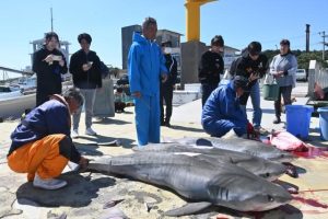 宮古総合実業高校商業科2年生は21日、サメ漁獲同行体験のテストツアーを行った。5人の生徒と教職員が池間漁協所属の漁船に乗船し、サメを釣り上げる様子を見学。帰港後は解体方法を習ったり、試食したりして観光ツアー化に向け理解を深めた。