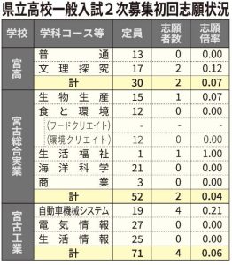 【那覇支社】県教育庁は21日、2025年度県立高校入試2次募集初回志願状況を発表した。宮古地区で2次募集があった高校の志願者数は、宮古工業高校が4人(募集定員71人)、宮古総合実業高校は2人(同52人)、宮古高校は2人(同30人)だった。