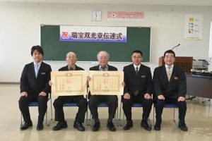 元中学校校長の砂川充男さん(88)、元小学校校長の野原辰雄さん(88)がこのほど叙勲瑞宝双光章を受章した。伝達式が24日、県宮古合同庁舎で行われ、県宮古教育事務所の平良吉嗣所長が勲位と勲章を手渡した。2人はそれぞれの教員生活を振り返るとともに受章に喜びと感謝を示した。