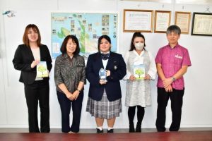 第16回子どもノンフィクション文学賞(主催・北九州市、北九州市教育委員会)で選考委員特別賞(あさのあつこ賞)を受賞した伊良部島中学校3年の我那覇優愛さんが26日、市役所で前泊直子教育長職務代理に受賞を報告した。我那覇さんは、文章を書くのが大好きで、同文学賞には「サシバ」を題材にして応募した。「サシバのことを多くの人に知ってもらいたいと思った。受賞した実感はないがうれしい」と話した。