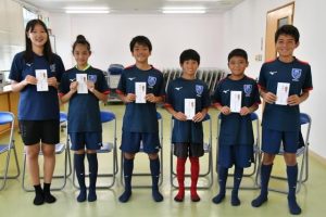 宮古サッカー協会(饒平名正会長)は29日、市陸上競技場会議室で奨励金交付式を行った。今年度の県トレセンに参加した児童生徒7人に奨励金を手渡した。交付を受けた児童生徒たちは「皆さんに良い報告ができるよう頑張りたい」などと目標を発表した。