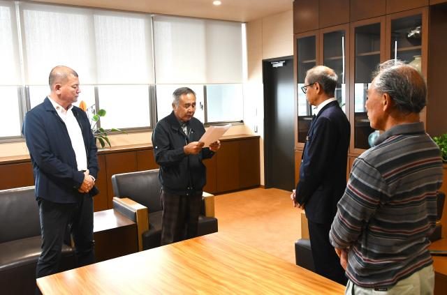 平良の久貝自治会(砂川忠弘会長)、松原自治会(亀川隆会長)は31日、嘉数登市長に、交通事故防止に関する要請を行った。児童生徒、住民の安全、安心な通学・生活環境確保するため、国道390号(通称久貝バイパス)への右折専用信号機、横断歩道設置の早急な実施を求めた。