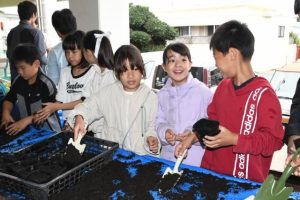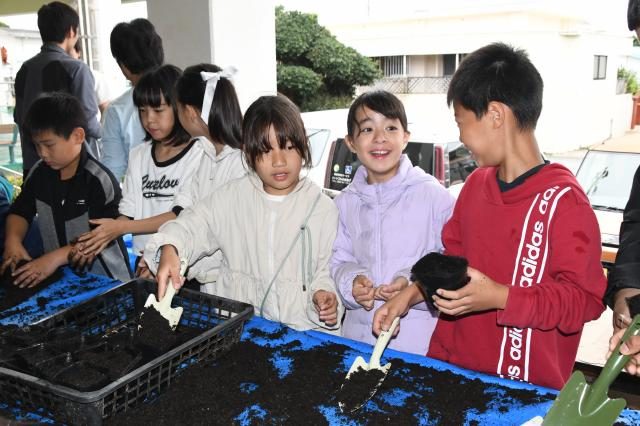 モリンガの森プロジェクト協会(矢部剛代表理事)、障がい者支援施設「ハートフルふきあげ」B型作業所、かりまた共働組合の3団体は1日、狩俣集落センターでモリンガの種まきイベントを開催した。同作業所の利用者や狩俣子ども会が参加し、「大きく育って」と願いながら300個の種をポットに植えた。