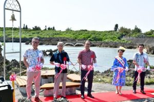 南西楽園リゾート(髙橋洋二会長)は4日、うえのドイツ文化村でハート岩「恋人の聖地」選定記念セレモニーを行った。パレス館前にある岬から西側にある岩が、ハート型に見えることから、岬の先端に「愛の鐘」と「ハート型モニュメント」を設置。関係者らがテープカットを行い、新たな観光スポットとして定着することを祈念した。