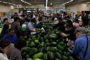 トウガンの魅力を広く市民にアピールし、地産地消と消費拡大を目指した「とうがんの日」キャンペーン(主催・同実行委員会)が10日、JAファーマーズマーケットあたらす市場で行われた。即売会では1個100円のトウガンを買い求めようと、販売開始前から長蛇の列ができた。用意された約1700個のトウガンは約1時間で完売した。