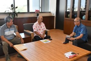 このほど発足した宮古島黒豆生産組合の渡真利朗男会長らが11日、市役所に嘉数登市長を訪ね「在来の黒豆で農業振興、地域振興をやってみようと20人の組合員でスタートした。生産を安定させ6次産業化をして地産地消を進めたい」と今後の活動に意欲を示した。国仲富美男副会長らが同席した。
