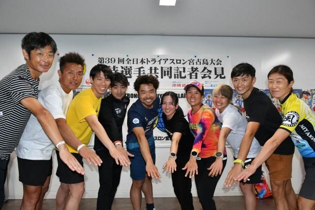 第39回全日本トライアスロン宮古島大会の招待選手による共同記者会見が18日、JTAドーム宮古島であり、招待選手10人が関係者や島民への感謝を胸に、それぞれの目標に向けて得意とするレース展開を誓った。総合3連覇を狙う寺澤光介選手(31、東京都)は「自分のベストパフォーマンスを最後まで出し切って3連覇したい」と意欲を見せた。