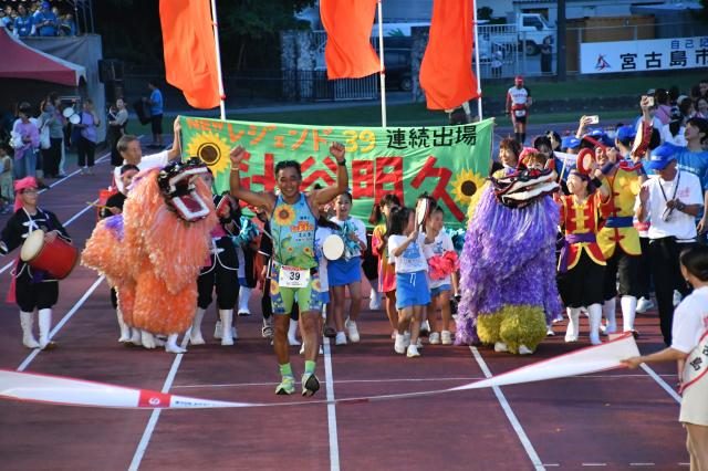 第39回全日本トライアスロン宮古島大会が20日、市内各地で行われ、12時間にわたる感動のドラマを繰り広げた。ゴールシーンでは選手と家族、仲間らが手をつなぎ、笑顔と涙でゴールテープを切った。65歳を迎えた選手にとっては年齢制限のため「ラストラン」となった。多くの仲間が集結して最後の勇姿を見届けた。選手らはボランティアや沿道の応援に感謝するとともに来年の40回大会での再会を誓い合った。