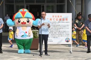 宮古島の豊かな自然の中で子どもの健やかな成長を願い市は24日、市役所で「宮古島市子育て応援宣言」を発表した。嘉数登市長が宣言文を読み上げ、「日本一子育てしやすい島を目指し、地域全体が一体となって取り組んでいく」と決意を新たにした。