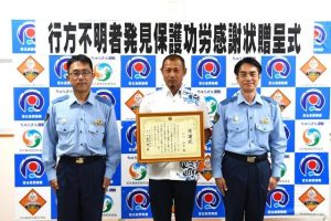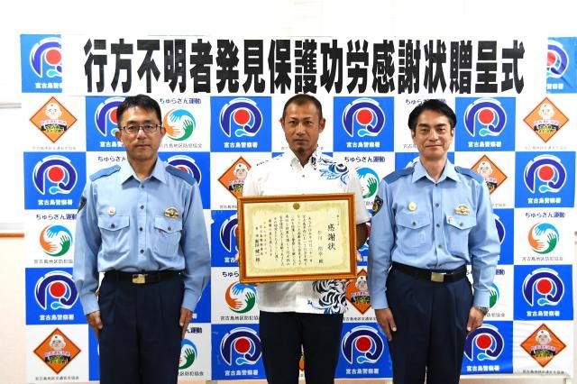 行方不明だった70代女性の発見、保護に協力したとして宮古島署(新垣健一郎署長)は7日、松川浩幸さん(41)に「対象者の安全確保に大きく貢献した」として感謝状を贈呈した。松川さんは「暑い中、道路脇の縁石に座りうずくまっていたので気になった。無事に助けることができて良かった」と話した。