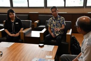 琉球銀行グループ「りゅうぎん総合研究所」の渡久地卓社長らが9日、市役所で嘉数登市長と会談し、就任のあいさつを行った。宮古島市と同研究所は、エコアイランド宮古島の実現に向け、官民共創で「一般社団法人宮古島千年プラットフォーム」を設立している。渡久地社長は「今後も連携しながら宮古島市の発展のために尽力したい」と述べた。