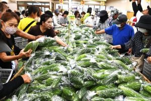 5月8日の「ゴーヤーの日」にちなんだ即売会(主催・宮古地区ゴーヤーの日実行委員会)が10日、JAおきなわファーマーズマーケットみやこ「あたらす市場」で行われた。1袋2本入りを通常よりも安価の100円で販売。多くの市民らが押し寄せ、約2000袋準備されたゴーヤーは約30分であっという間に完売した。