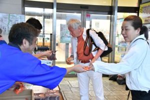 「黒糖の日」消費拡大キャンペーン(主催・県宮古農林水産振興センター、宮古製糖)が10日、JAおきなわファーマーズマーケットみやこ「あたらす市場」で行われた。多良間島産の黒糖とチラシを手渡し、「多良間の黒糖はいかがですか」「おいしいですよ」とPRした。