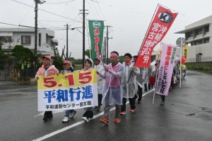 「5・15平和行進」(主催・平和運動センター宮古島)が11日、市役所をスタートし、市街地約6㌔を巡るコースで行われた。主催者発表によると雨が降る中、約70人の労働組合の組合員や市民らが参加し、基地や戦争のない平和な世界の創造を訴えた。平和行進は県内3カ所で実施される。宮古を皮切りに15日に石垣市、17日には沖縄本島で行われる。