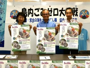 「ごみゼロの日」である5月30日、「島内ごみゼロ大作戦」と題して島内一斉ごみ拾いが行われる。ボランティアで海岸清掃に取り組んでいる宮古の海をキレイにし隊(井上美香隊長)が主催し、宮古島市が全面協力する。今年は市制施行20周年記念事業も兼ねており、参加団体には「記念コラボタオル」が贈られる。16日、井上さんと嘉数登市長らが市役所で会見し、多くの市民の参加を呼び掛けた。