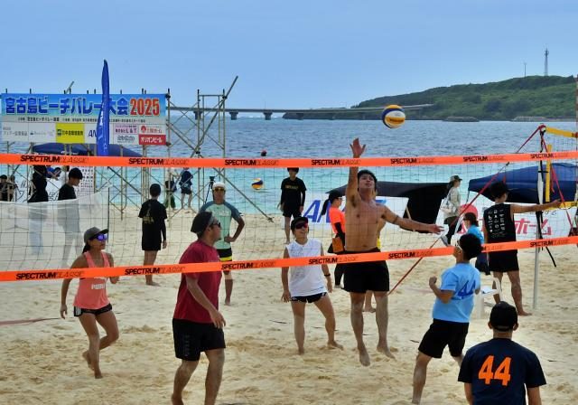 宮古島ビーチバレー大会2025(主催・宮古島ビーチバレー連盟)が24日、下地与那覇の前浜ビーチで開幕した。男女混成(男女各2人)4人制に過去最多の55チームが出場。初日は予選グループ戦を行った。同日夕には5回目の開催を記念して「ふれあいパーティー」が実施された。2日目は各トーナメントと表彰式が行われる。