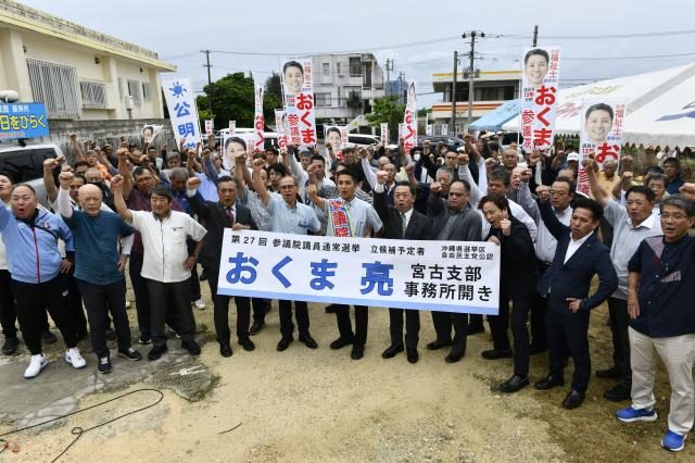 7月20日執行予定の参議院議員選挙で沖縄選挙区から立候補を予定している元那覇市議会議員の奥間亮氏(38)は25日、平良下里で宮古島支部の事務所開きを行った。奥間氏は、警察官としての勤務や3期12年の那覇市議として活動してきた実績を強調し、15年ぶりの選挙区での勝利を誓った。事務所開きには嘉数登市長、保守系の県議2氏や市議らが訪れ、選挙区は「奥間」、比例は「公明」と訴えた。