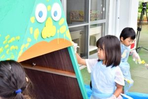 上野こども園(仲田友実園長)で26日、「ごみゼロの日(5月30日)」のキャラクター「ゴミマズムヌ」に子供たちが色を塗り、ごみの分別やぽい捨て防止の重要性を楽しみながら学んだ。色を塗った「ゴミマズムヌ」は、ごみゼロの日に軽トラックに載せて島内を巡回してごみを回収する。