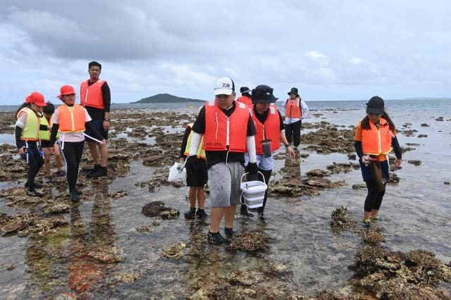 池間小中学校(平良吉嗣校長)は28日、地元の伝統文化体験として、池間島沖のリーフで海の生物を観察する体験学習を行った。全校児童生徒15人は魚や貝、カニなどを見つけると「いた」「あった」などと喜ぶとともに写真撮影し、観察した。