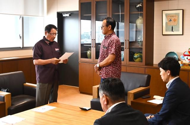 下地島空港施設(SAFCO)などは29日、砂川朗副市長に宮古空港保安検査業務に伴うスマートレーンの設置などの要望書を手渡した。保安検査場の混雑解消を目的とした業務の効率化、検査員の処遇改善を図りDX化を推進するために協力を求めた。石垣空港では、来年3月に供用開始を予定している。要望書はSAFCOと下地信広市議名。下地市議が読み上げて手渡した。