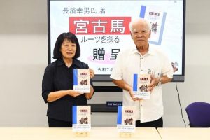 宮古馬の保存活動に長年取り組んでいる長濱幸男さんは29日、調査結果をまとめた著書「宮古馬 ルーツを探る」を市内の小学校11校(各1冊)や市立図書館などに計20冊を寄贈した。長濱さんは「宮古馬の知られていない部分にも関心を持ち、教育機関や多くの市民の目に触れてほしい」と語った。