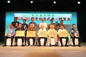宮古森林組合(組合長・嘉数登市長)は5月30日、創立30周年の記念式典と祝賀会を市内のホテルで開催した。式典では設立30年のあゆみとして写真や当時の新聞報道で振り返るとともに、功労者12人に感謝状を贈呈した。祝賀会では舞踊や三線演奏の余興を楽しみながら組合のさらなる発展を誓い合った。