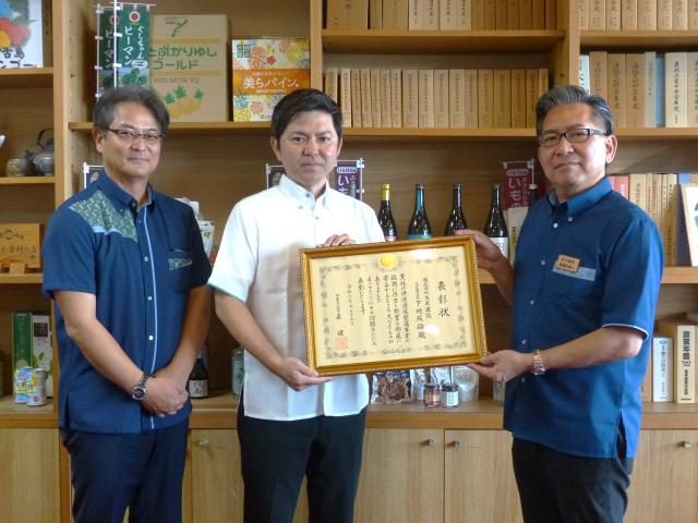 【那覇支局】大米建設(下地辰倫社長)はこのほど、水産庁が主催する2025年度漁港漁場関係事業優良請負者表彰で、水産庁長官から表彰された。表彰されたのは2016年度以来9年ぶり2度目。下地社長と同社の名幸志浩土木部長は2日、県庁で県農林水産部の喜屋武盛人部長に表彰されたことを報告。下地社長は「最近は会社としても品質管理などに最も注力しており、その成果が現れていると実感している。これらの経験や取り組みが認められた結果、名誉ある賞を受賞することができた」と喜びを語った。