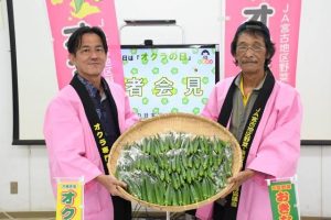 JAおきなわ宮古地区野菜・果樹生産出荷連絡協議会オクラ専門部会の砂川康男部会長、同宮古地区営農振興センターの与那覇悟センター長は3日、JAおきなわ宮古地区本部で会見し、「オクラの日」の6日、JAファーマーズマーケットあたらす市場でオクラ一袋(12本入り)を80円の安価で販売する即売会を開催すると発表し、多くの市民の来場を呼び掛けた。