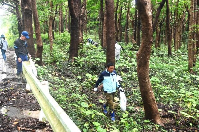 市水道部(砂川勤部長)は6日、水道週間(1~7日)にちなみ、水道水源保全地域の大野山林で清掃活動を行った。同部職員と宮古管工事業協同組合に加盟する事業者のほか、一般市民ら合わせて約70人が集まり、草むらに捨てられたペットボトルや缶、瓶、不法投棄されたとみられるごみを拾い集め汗を流した。