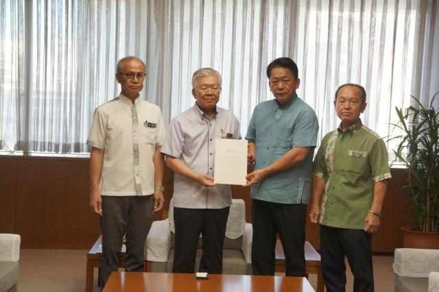 【那覇支局】県市長会長の中山義隆石垣市長や嘉数登宮古島市長らは11日、県庁で大城肇副知事に、県が観光目的税(宿泊税)を原因者課税や法定外普通税への見直しを検討していることに抗議し、観光目的税制度の早期導入を要請した。抗議・要請文は玉城デニー知事宛て。