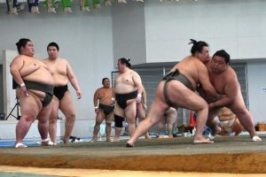 大相撲時津風部屋の宮古島合宿が19日、JTAドーム宮古島でスタートした。初日は午前8時から朝稽古を行い、迫力のあるぶつかり稽古などで見学に訪れた市民らを沸かせた。合宿は24日まで行われ、23日を除き、一般公開される。そのほか力士らは期間中、市内の小学校や介護施設などを訪問する予定で、子供たちやお年寄りと交流を深める。