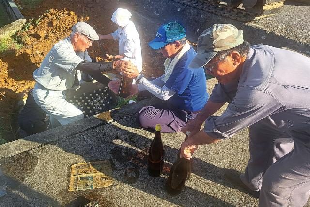 高野自治会(川満富夫会長)は21日、2008年に県のスプリンクラー施設整備事業完了を祝って、高野公民館の敷地内に埋めたタイムカプセルを開封した。同自治会会員らは、コンクリートの箱型カプセルの中から泡盛1升瓶105本、ビニール袋に入れたその日(2008年9月3日付)の新聞紙を取り出し、当時を振り返り懐かしんでいた。