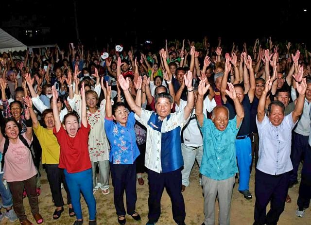 【多良間】任期満了に伴う多良間村長選挙は22日、投開票が行われ、現職の伊良皆光夫氏(70)=無所属=が381票を獲得し、4期目の当選を果たした。新人の古謝政一氏(66)=無所属=に9票差をつけ、一騎打ちを制した。村政の「継続」「刷新」について島を二分しての論戦が繰り広げられ、有権者は今後4年間の未来に向け「継続」を選択した。