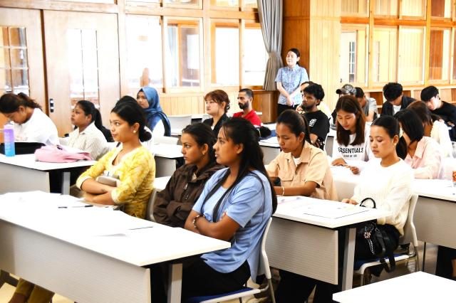 宝塚医療大学観光学部の学生は23日、沖縄戦を学び、戦争と平和について考えた。同学部宮古島キャンパスには、アジア9カ国の外国人が在籍しており、母国で紛争を体験した学生もいる。昨年の「慰霊の日戦没者追悼式」で、仲間友佑さん(当時宮高3年)が朗読した「平和の詩」を学生たちが聞き、それぞれの思いを発表した。