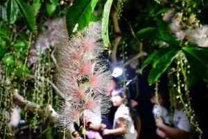 平良添道のサガリバナ群生地で夜間ライトアップをする「第13回添道サガリバナ夜のお花見」(主催・宮古島環境クラブ)が25日から始まった。明かりに照らされて幻想的な美しさで夜を彩るサガリバナと、ベニサガリバナの開花を一目見ようと、初日から多くの市民や観光客が訪れた。期間は7月4日まで。
