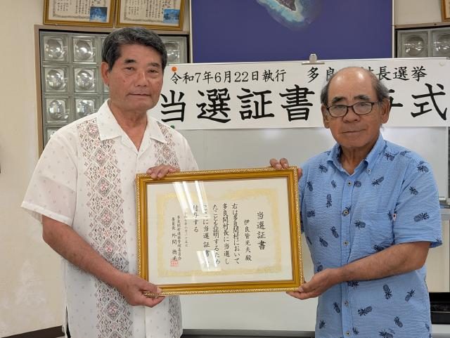 【多良間】村選挙管理委員会(外間徳光委員長)は25日、多良間村長選で4期目の当選を果たした伊良皆光夫氏に当選証書を付与した。伊良皆氏は「全ての問題を解決しなければならない」と意欲を示し、人口減少対策や住宅不足問題、行政職員確保や地域維持の課題解決に向け、村民に協力を呼び掛けた。