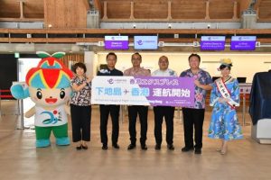香港エクスプレスの下地島-香港路線が27日、運航再開した。コロナ禍で運休してから5年4カ月ぶり。下地島空港で再開を記念する式典を開催。市や県、空港関係者らが集まり、テープカットなどで祝い、乗客172人を盛大に出迎えた。運航期間は10月25日までの4カ月間。砂川朗副市長は「宮古島市民にとっても香港がより身近な存在となり、国際的な交流が一層活発になることを期待している」と述べた。