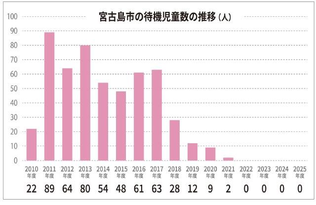 県子育て支援課はこのほど、県内の待機児童数(2025年4月1日時点速報値)を発表し、宮古島市は4年連続でゼロを達成したことが分かった。市こども未来課は、少子化による申し込み数の減少が続いていることを要因に挙げた。入所者は1920人となり、昨年の1992人に続き、2000人台を下回った。