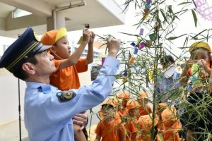 宮古島署(新垣健一郎署長)は3日、同署で「七夕祈願作戦」を行った。同署の署員や宮古島地区交通安全協会の会員、いけむらこども園(松元司園長)の園児(4~5歳児)24人が参加して、安全安心な地域となるよう願いを込めて書いた短冊をササに飾った。