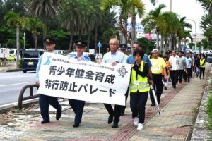 2025年度「青少年の非行防止」県民一斉行動宮古島市民大会(主催・市、市教育委員会)が7日、マティダ市民劇場で行われた。青少年の健全育成に関わる20団体の関係者らが参加し、青少年を事件事故から守るため、全市民で青少年の非行防止活動を展開し、より良い育成環境の実現へ決意を新たにした。大会後は、多くの市民に青少年の非行防止を訴えようと、旧市役所平良庁舎までパレードした。