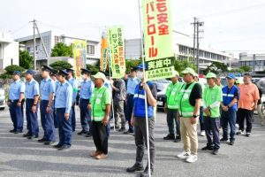地域安全防犯パトロールの出発式が9日、宮古島署(新垣健一郎署長)で行われた。同署の署員や宮古島地区防犯協会(前川尚誼会長)のメンバーが参加し、青少年や地域の安全に向けて決意を新たにした。式後、参加者らはパトカーや青色回転灯車に乗り込み街頭パレードに出発した。