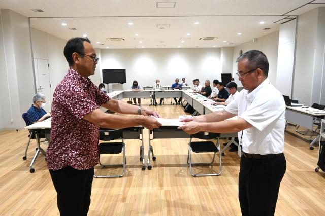 2025年度第1回市自殺対策行動計画委員会(委員長・砂川朗副市長)が9日、市保健センターで開催された。砂川委員長が、新委員の上地俊暢総務部長ら6人に委嘱状を交付。その後は非公開で市における自殺の状況、24年度の取り組み評価、25年度の目標などが示され、委員らで意見交換を行った。