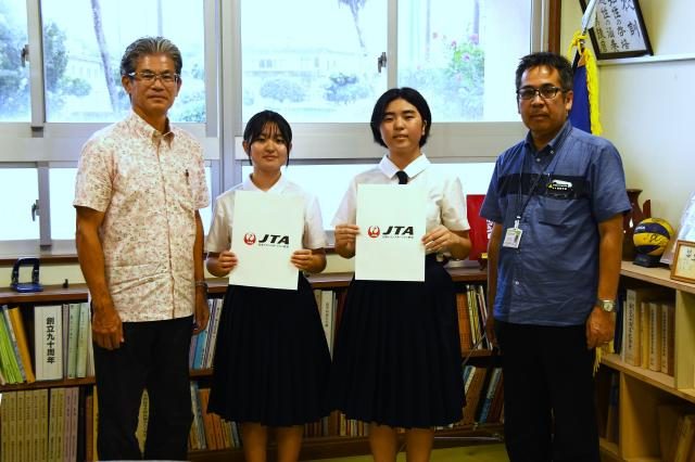 日本トランスオーシャン航空(JTA)は18日、宮古高校(松原芳和校長)で、琉球大学医学部での体験授業に参加する平良絢佳さん(2年)、友利心海さん(1年)に宮古-那覇間の往復航空券を贈呈した。玉城支力社長は「離島から医学部を目指す生徒たちの手助けになれば。将来は地域医療を担う存在に成長してほしい」と激励した。