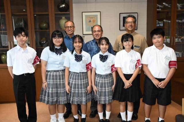 嘉数市長(後列左)、宮城教育長(同右)を表敬訪問し取材活動に意欲を示す豆記者の皆さん=24日、市役所